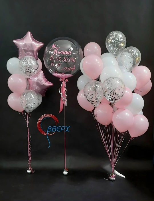 *Большой шар баблс с перьями (розовые, белый, ) и метрикой (роз) - 1500р